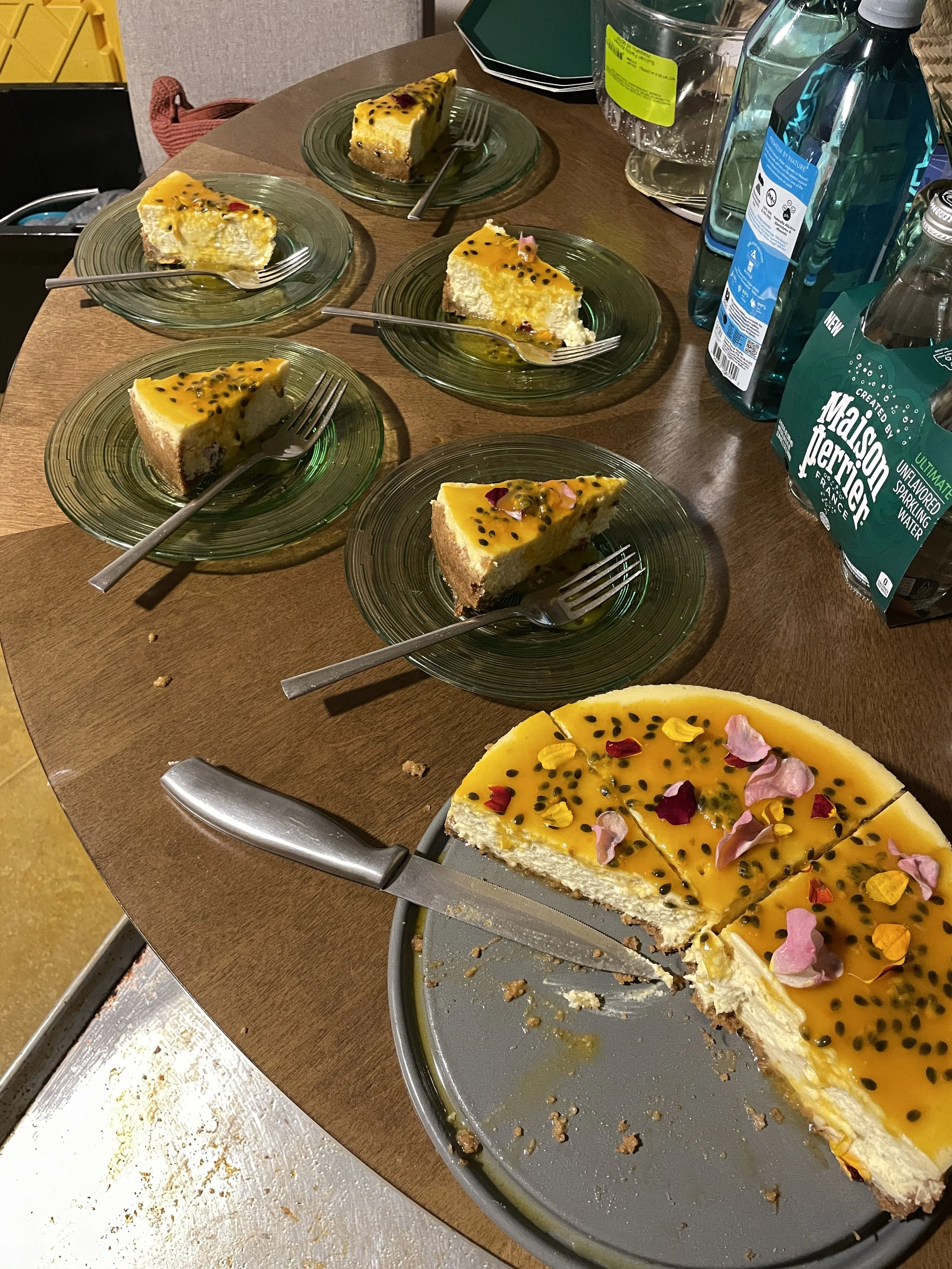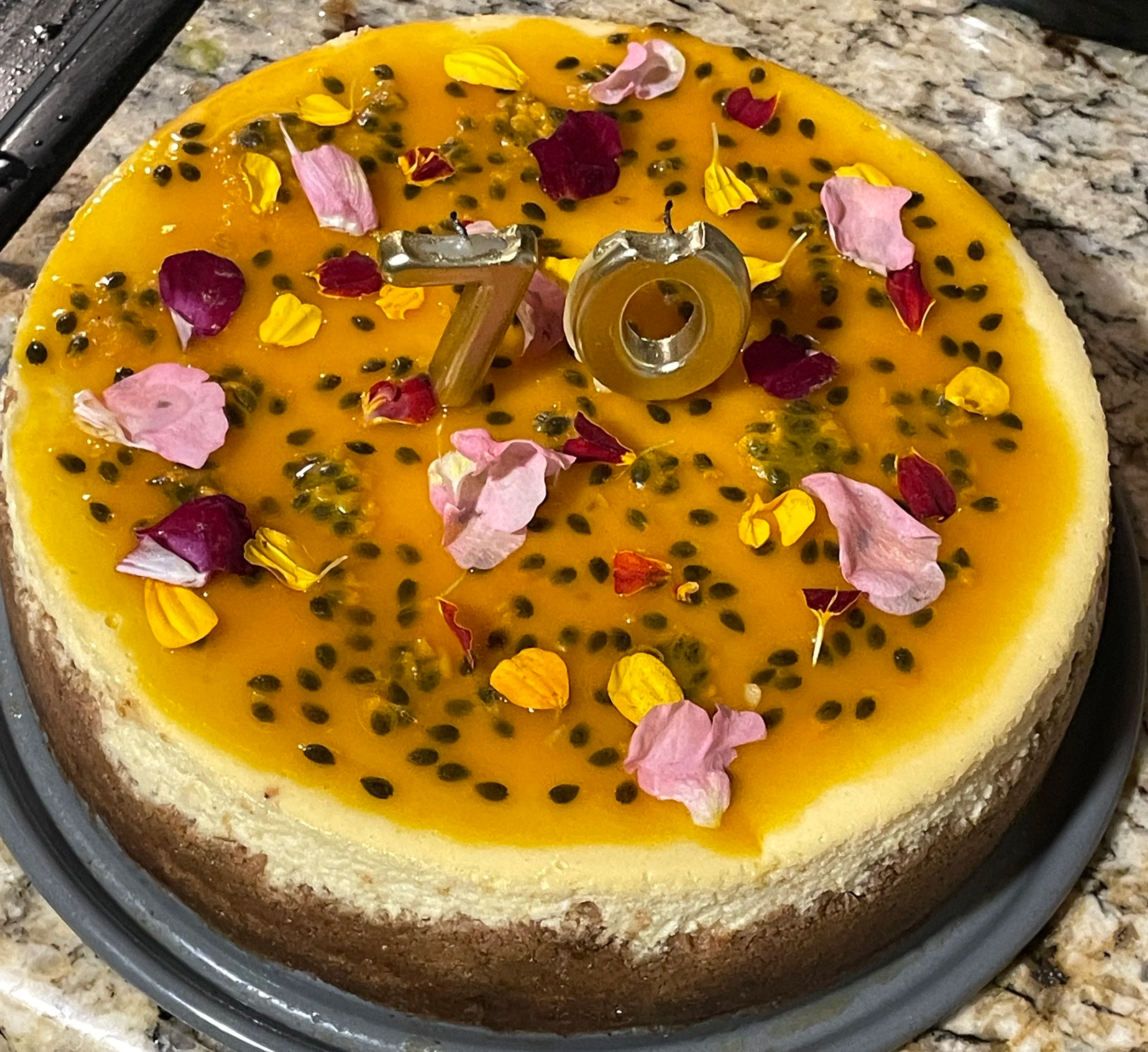 Let me start off by saying, I’ve never been a “cheesecake person”. I’ve always found it too heavy and honestly quite bland in texture and flavor. That being said, if someone put one in front of me, I’d take a few bites - but it’s never the dessert I would order off the menu. I recently received a request from a client to make a cheesecake for her father’s 70th birthday, so it was time to make a cheesecake that even I could be excited about. I knew it needed to be passionfruit, 1. because a friend had recently gifted me some fresh passionfruit that were ready to be used, and 2. because the bright tartness of passionfruit would cut through the heaviness of all that cream cheese. I also had an abundance of goat cheese leftover from another event, so I knew I wanted to incorporate that as well.